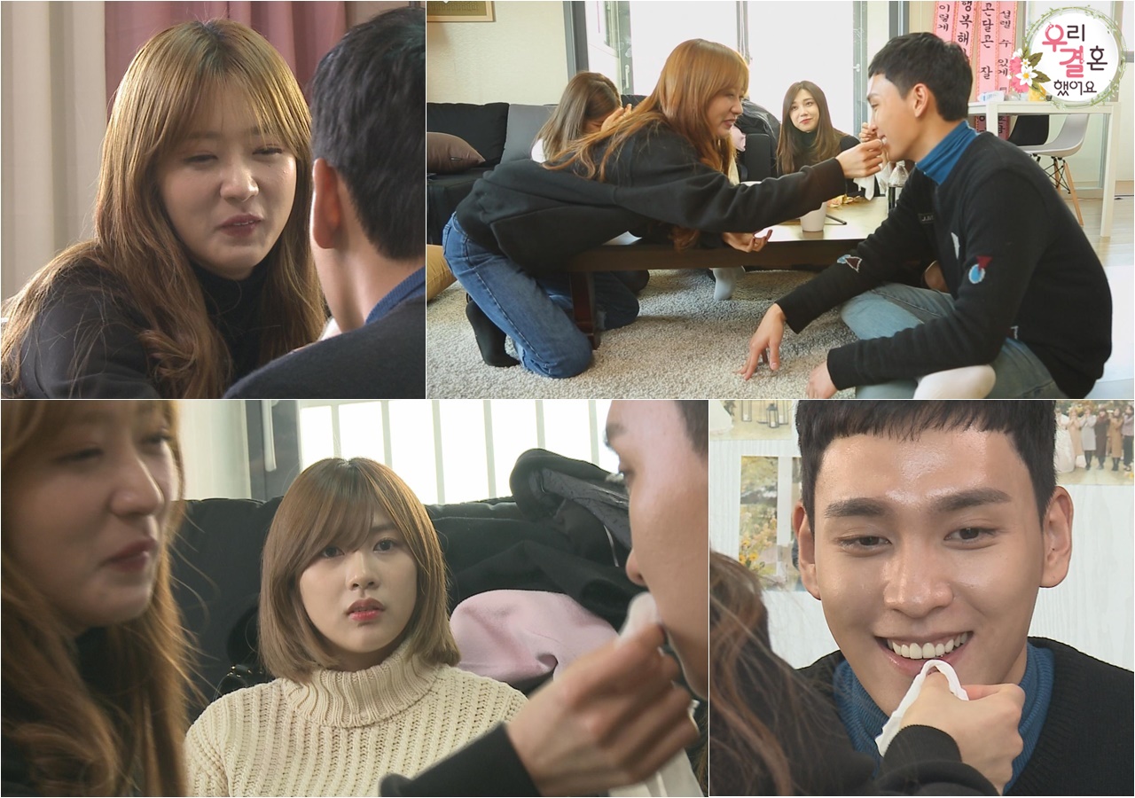 <우리 결혼했어요> 윤보미가 최태준의 입술을 만지는 사진이 공개돼 시선을 모은다. 윤보미는 자신이 속한 걸그룹 에이핑크 멤버들 앞에서 ‘남편’ 최태준을 향해 돌진, 과감한 스킨십으로 모두를 깜짝 놀라게 만든 것으로 전해져 더욱 궁금증을 증폭시키고 있다.