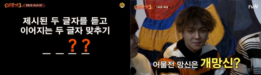 3. 사자성어 게임 & 네글자 게임제시된 두 글자를 듣고 이어지는 두 글자를 맞추는 게임이다. 앞의 두 글자 제시 후 1~2초 내로 답을 해야 한다. 총 4글자이므로 사자성어 중에서 주로 문제를 냈었으나 사자성어 대신 4글자로 된 단어를 맞추는 게임으로 응용할 수도 있다. 멤버 수가 많지 않아도 할 수 있으며 게임에 참가한 사람들의 창의력을 확인 할 수 있다는 장점이 있다.