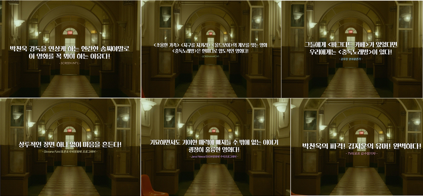 이번에 공개된 티저예고편은 기하학적으로 표현된 좌우대칭의 강렬한 미장센이 시선을 사로잡는 노래방 복도를 배경으로 영화제 프로그래머, 평론가 및 언론의 극찬 리뷰를 실었다.