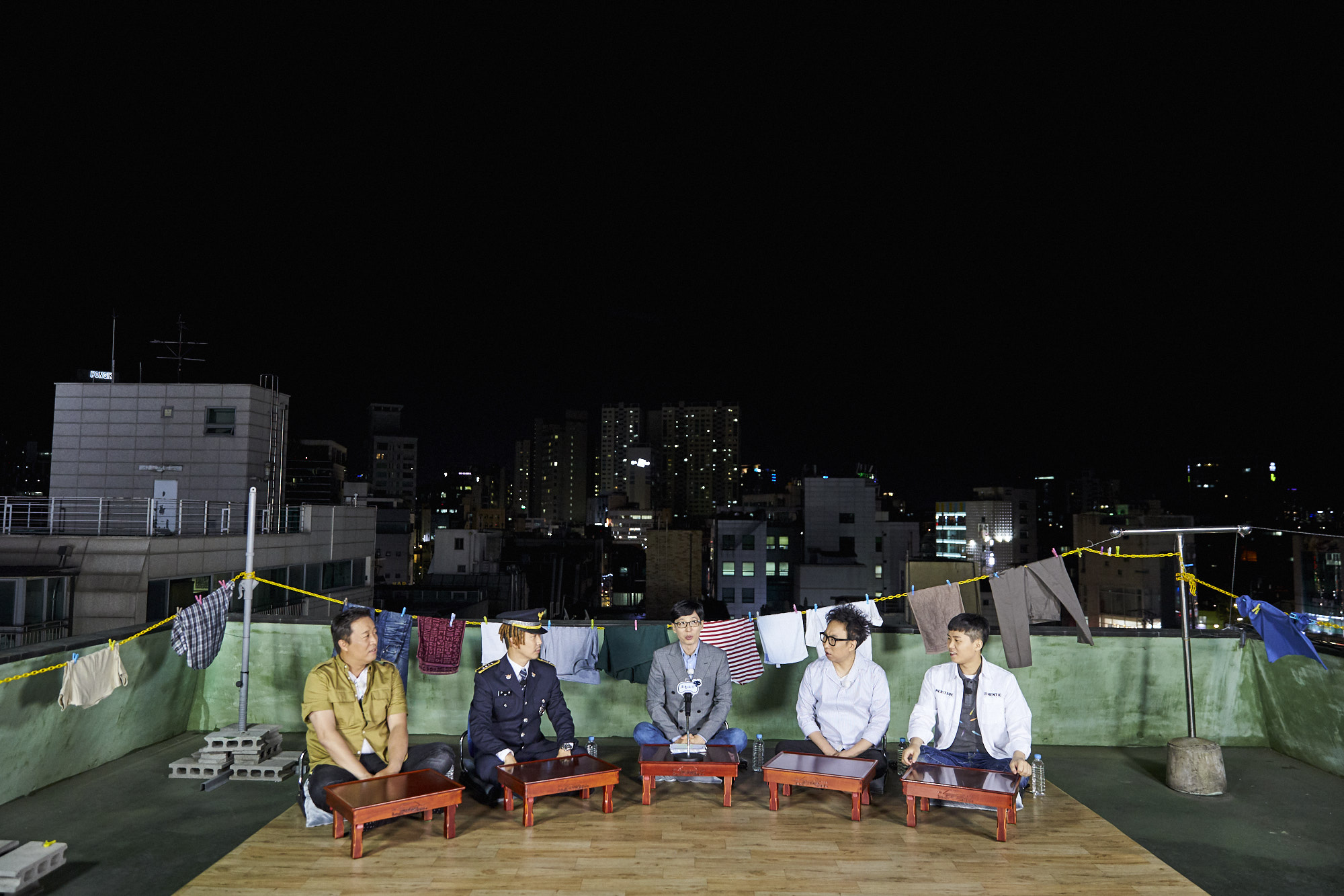 실내 뉴스 스튜디오가 아닌 젊은이들의 거리, 홍대의 한 건물 옥상에서 진행된 ‘무한뉴스’에서는 <무한도전>에서 일어나는 크고 작은 소식들을 재치 있게 전달한다.