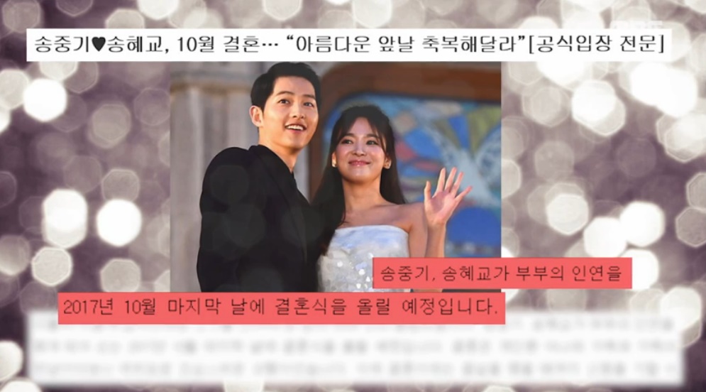 지난 5일 송중기는 10월 마지막 날에 결혼식을 올릴 예정이라고 발표했고, 직후 송혜교도 결혼 소감을 발표했다.