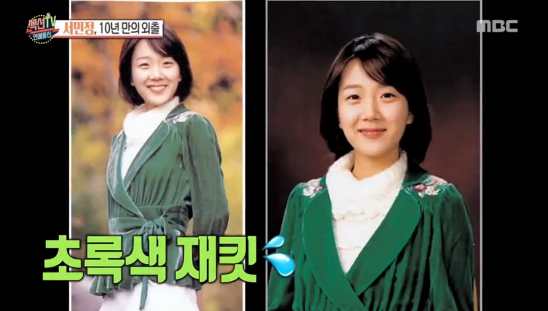 모교를 찾은 서민정은 졸업 사진 촬영 당시 “옷이 없어 집에 있는 초록색 자켓을 입었다.”고 밝히며 당시의 졸업사진을 공개했다.