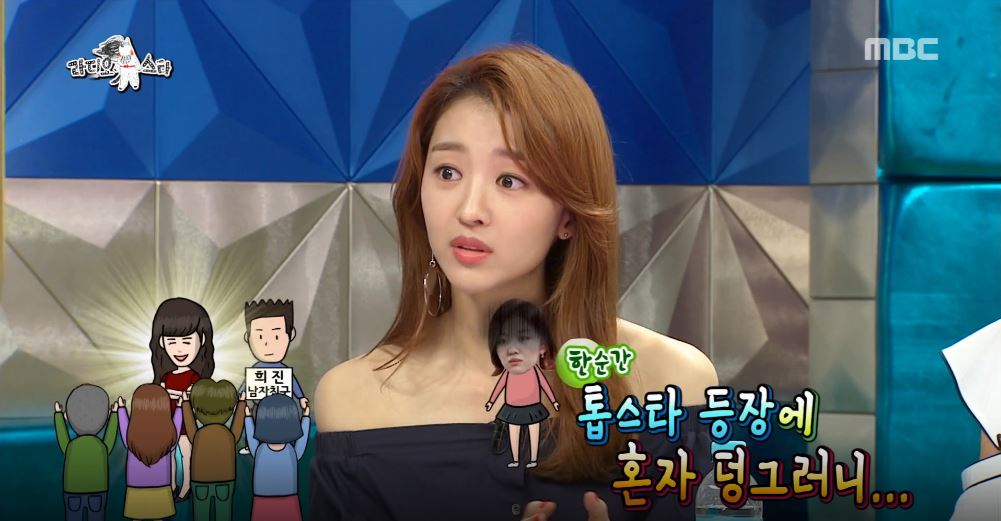 또한, 장희진은 “전 남자친구의 전 여자친구가 톱스타였다. 남자친구 형의 결혼식에 갔는데, 그 톱스타도 나타나 모두 그쪽으로 몰렸다”라고 밝혀 모두를 놀라게 했다. 이어 그녀는 “혼자 집에 가면서 엄청 울었다. ‘내가 저 톱스타를 꼭 이기리라!’ 맘먹었다”라고 전했다. 이에 김구라가 “지금은 이겼나?”라고 묻자, 장희진이 “아직 못 이겼다”라고 답해 눈길을 끌었다.