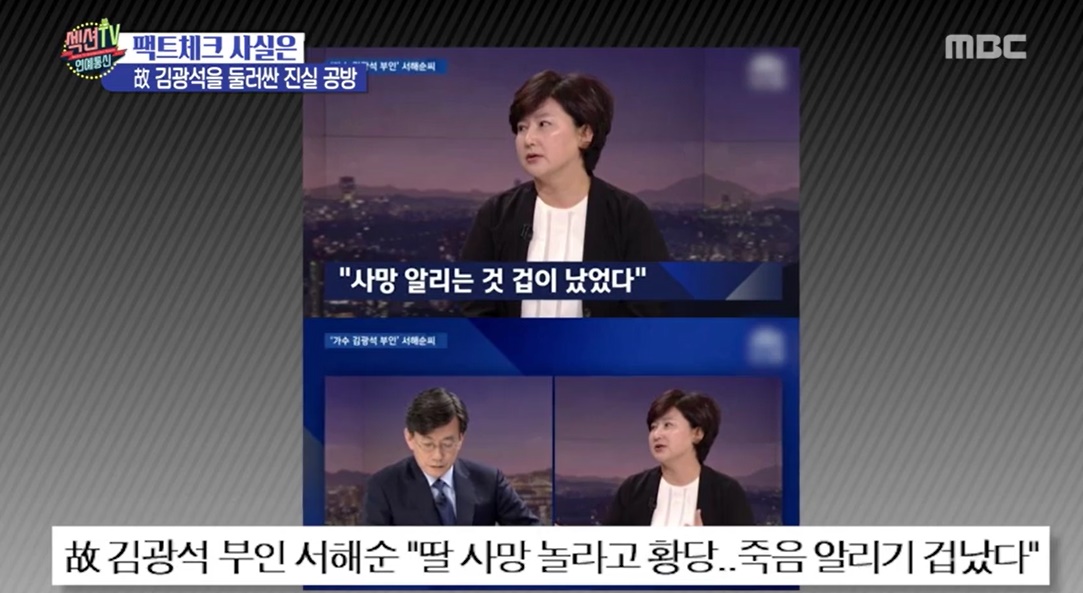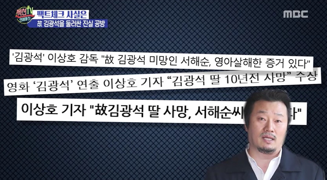 19일에 방송된 MBC 예능프로그램 <섹션TV 연예통신>에서는 20년 동안 김광석을 취재해온 이상호 기자의 의혹에서 시작된 이상호-서해순 사이의 진실공방에 대해 다뤘다.