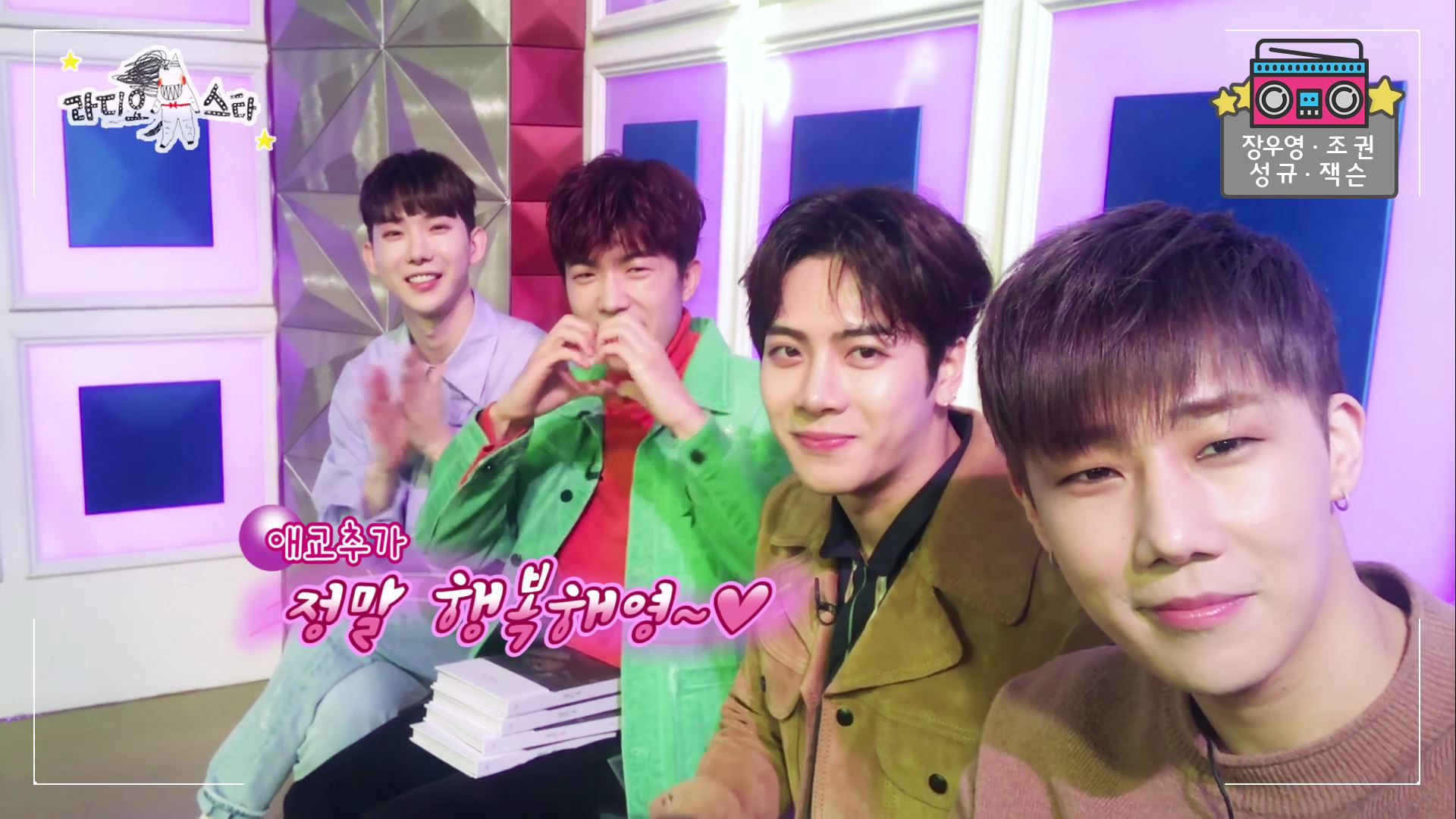 이어 잭슨은 "'라디오스타' 출연할 수 있어서 정말 행복해요."라며 기쁜 마음을 드러냈다. 이에 우영과 조권은 잭슨의 말에 덧붙여 더욱 높은 톤과 사랑스러움을 담은 "행복해요."로 아이돌스러움을 발산하며 웃음을 자아냈다.
