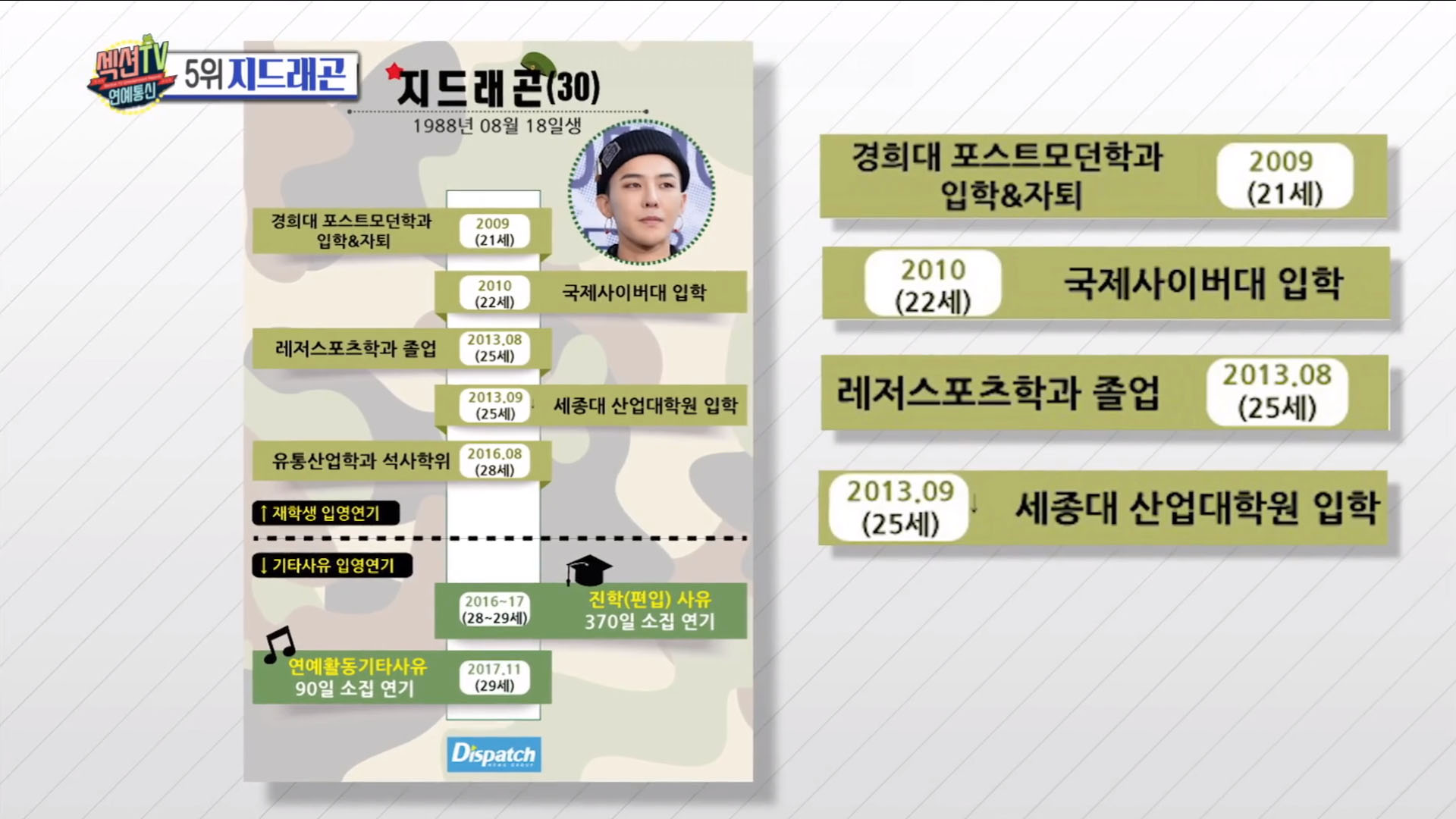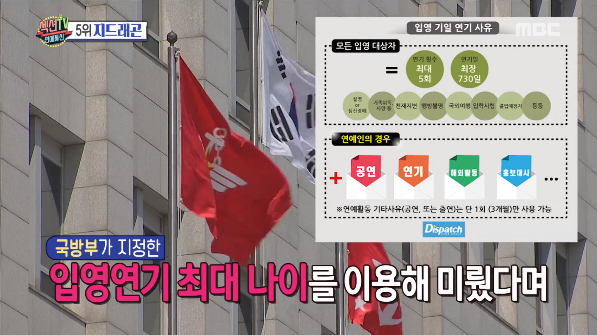 또한 “합법적인 절차로 연기했지만 국방부가 지정한 입영최대 연기기간 6개월 전까지 군대를 미뤄 논란이 일었고 논란이 제기된지 불과 1개월 만에 입대를 결정하여 빅뱅 멤버 중 두 번째로 군복무를 시작했다”고 전했다.