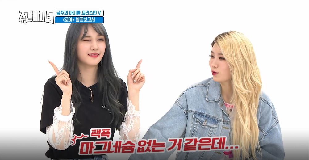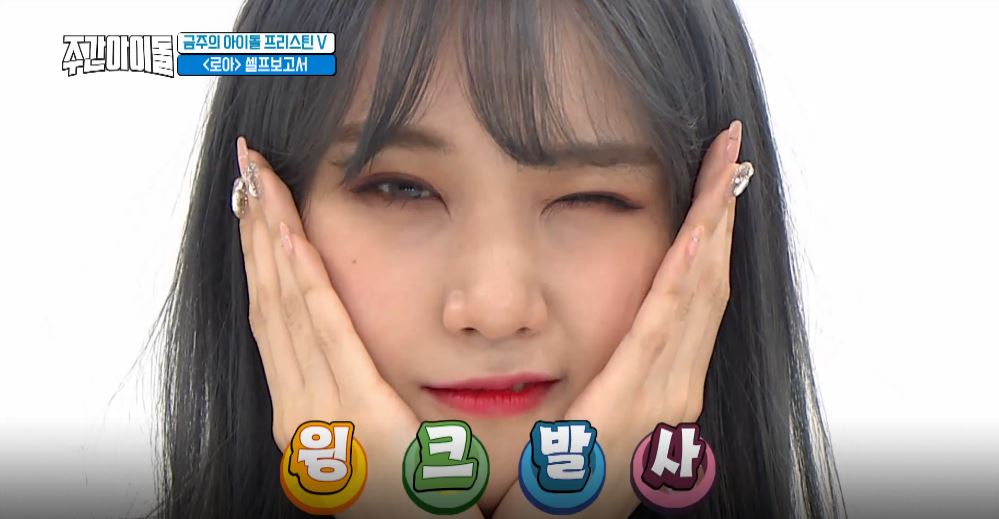 로아는 ‘셀프 보고서’ 코너에서 “윙크를 빠르게 할 수 있다”라고 밝혔다. 이에 MC들이 “1년 전에 오렌지 캬라멜 레이나에게 윙크 개인기를 뺏기지 않았나?”라며 우려했다. 로아는 “그동안 눈을 단련해서 더 빠르게 할 수 있다”라며 자신감을 드러냈다.