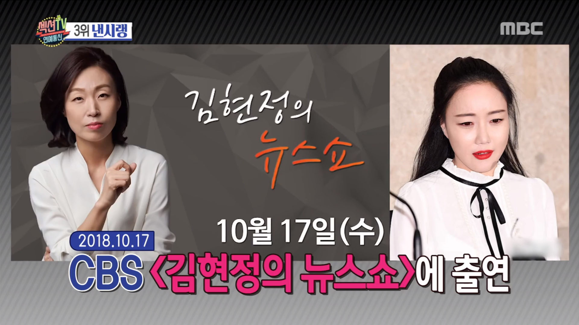 MBC '섹션TV 연예통신'은 매주 월요일 오후 8시 55분에 방송된다.