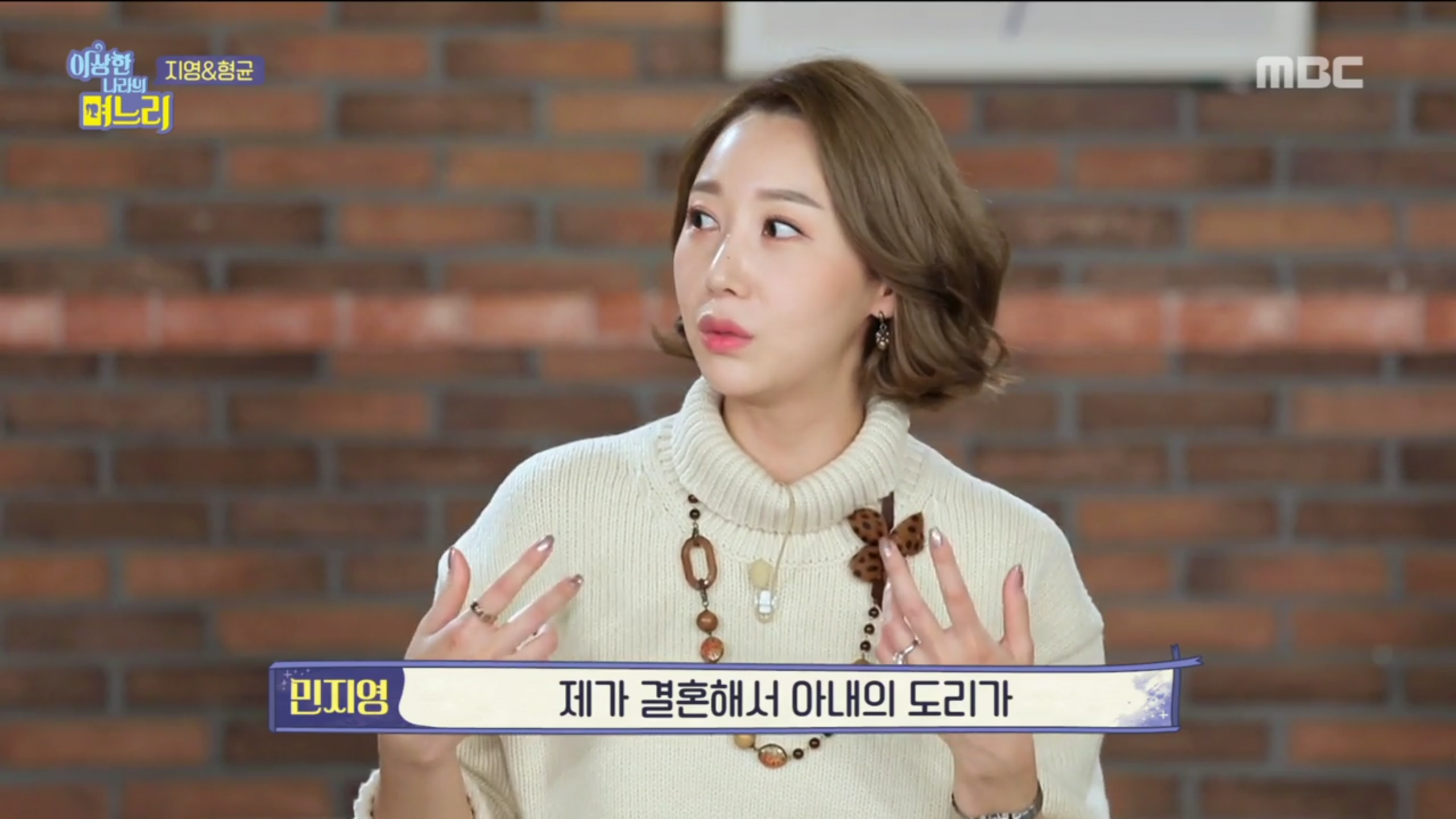 민지영은 "제가 결혼해서 아내의 도리가 모든 살림이나 음식을 다 잘해야 하지 않을까하는 생각을 했었다. 그런데 그건 아닌 것 같다"고 답했다.