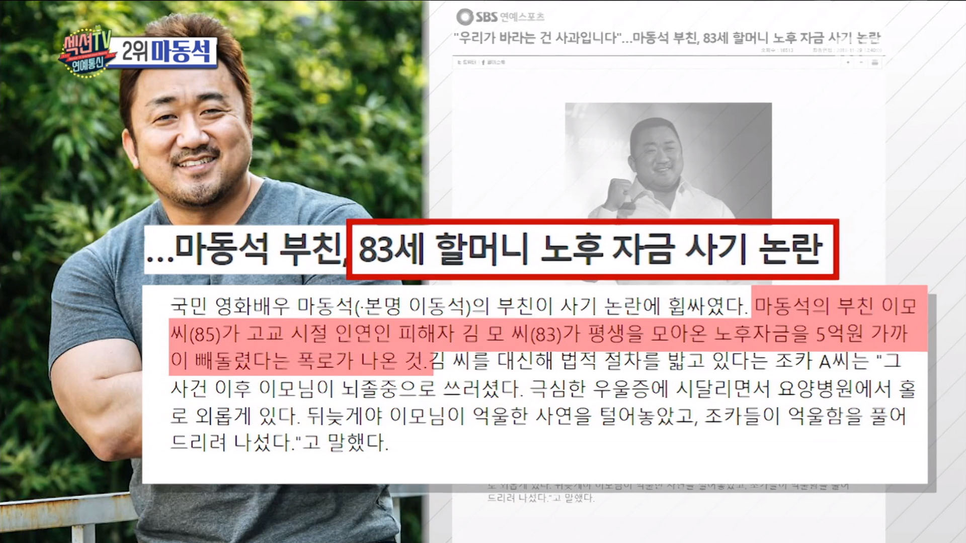 3일 방송된 ‘섹션TV 연예통신’에서는 마동석이 부친 사기 논란으로 인한 피해자와 첨예한 대립을 이루고 있다고 방송했다.
