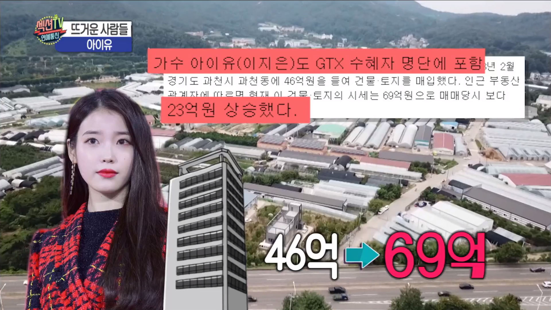 지난 7일 한 매체는 아이유가 46억원으로 매입한 경기도 과천과 토지가 GTX 사업의 수혜로 1년 만에 23억원의 시세 차액을 얻었다고 보도했다.