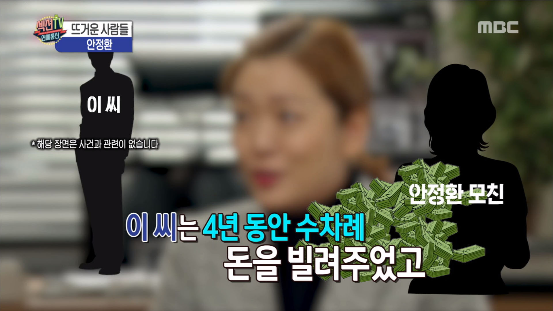 이씨는 안정환 모친이 홀로 축구선수 안정환의 뒷바라지를 하고 있다며 금전적인 도움을 요청했고 이에 수차례에 걸쳐 4년 동안 돈을 빌려줬다고 밝혔다. 이씨는 안정환 모친이 돈을 빌린 이후 안정환이 구단과 계약을 앞둔 단계이고 4배의 계약금을 받을 수 있을 것이라며 당시 국가대표로 활동하던 안정환을 빌미로 채무변제를 계속해서 연기했다고 말했다. 하지만 그 후 모친은 거액의 도박 빚을 지고 절도 혐의로 구속되었고 이에 이씨는 안정환 외삼촌을 찾아갔으나 ‘안정환이 갚을 돈’이라며 변제를 회피했고 안정환 소속사 측에 문의했지만 안정환이 해외에 있다는 답변을 들었다고 밝혔다. 논란이 거세지자 안정환은 “집을 팔고 연봉 전체를 쏟아 부어 어머니의 빚을 갚았다”고 밝히며 안타까운 가정사를 고백했다. 이에 동정의 여론이 일며 응원의 목소리가 높아졌다.