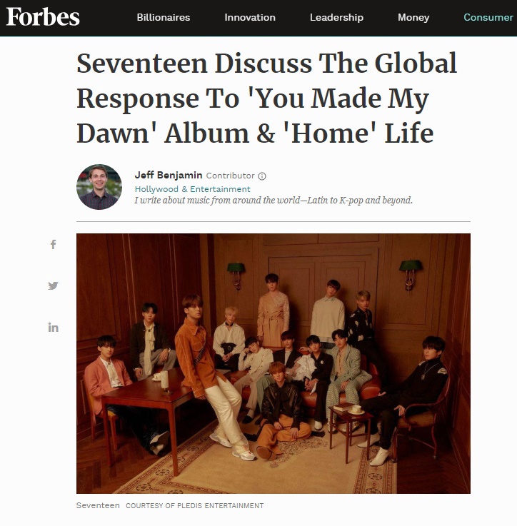 미국 유력 경제지 포브스(Forbes)는 지난 14일(현지 시간) ‘Seventeen Discuss The Global Response To 'YOU MADE MY DAWN' Album & 'Home' Life’라는 제목으로 세븐틴의 미니 6집에 대해 심층 인터뷰를 다룬 기사를 게재, 전 세계의 이목을 끌었다.