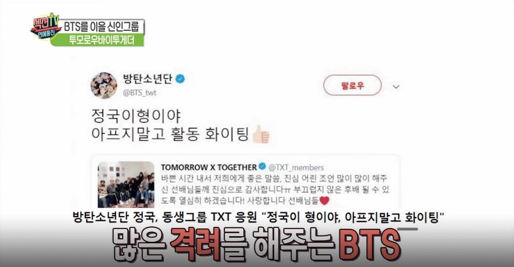 한편, 방탄소년단 막내 정국은 최근 SNS에 “정국이 형이야. 아프지 말고 활동 파이팅”이라며 투모로우바이투게더에 대한 ‘후배 사랑’을 드러내 훈훈함을 자아냈다.