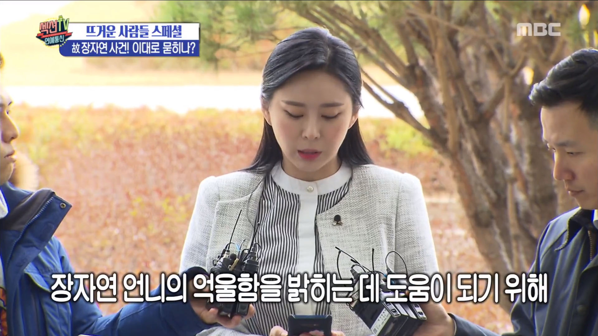 故장자연 사건의 유일한 증언자인 윤지오는 “장자연 언니의 억울함을 밝히는데 도움이 되기 위해 오늘 이 자리에 나왔습니다.”라며 입장을 전했다. 재수사 청원으로 얻은 기간이 2주밖에 남지 않아 가려진 진실을 파악하기에는 턱없이 부족한 상황이다. 윤지오와 故장자연의 지인인인 이모씨는 자신을 자유롭게 만들어 줄 것이라 생각해 작성한 ‘장자연 문건’은 당시 다른 여배우를 위해 이용되고 공개된 것이라고 말하며 이것이 공개되는 것을 두려워하고 괴로워했다고 언급했다. 또한 윤지오는 문건을 작성하게 한 그들이 故장자연을 죽음으로 몰고 간 직접적 원인이라고 하며 “죽음으로 몰고 간 그 분이 죄의식 없이 배우의 삶을 살고 계세요. 그런 부분은 볼 때마다 너무 분노가 치밀어 오르는 게 사실이고...”라고 덧붙였다.