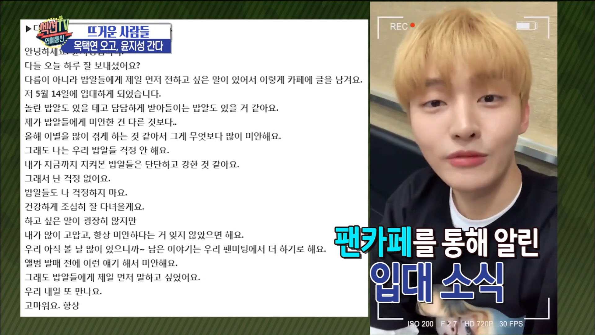 16일 방송된 ‘섹션TV 연예통신’에서는 워너원 멤버 중 첫 번째로 입대하는 윤지성 소식을 전했다.
