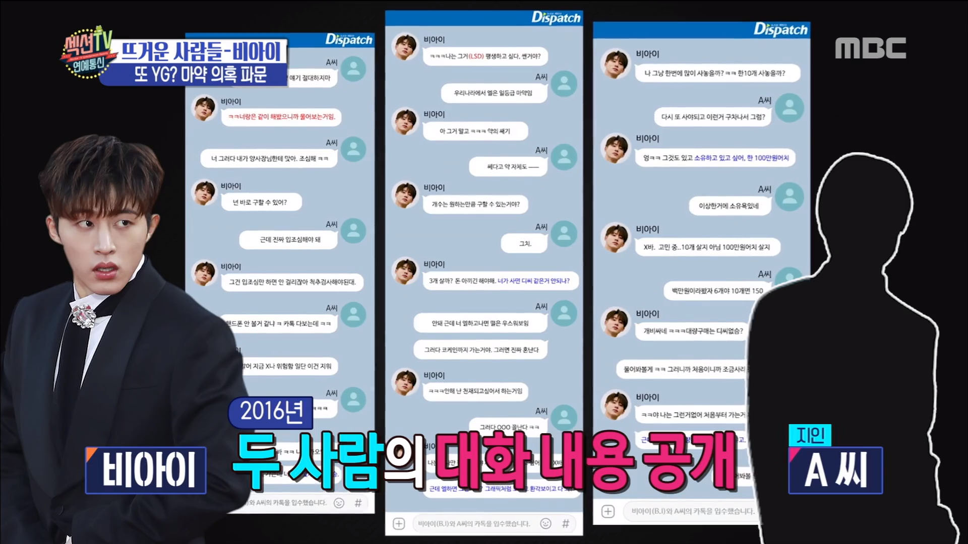 해당 매체는 2016년 비아이가 지인 A씨와 나눈 마약 구매 및 투약 정황이 담긴 대화 내용을 공개했다. 공개된 내용에서 비아이는 ‘원하는 만큼 구할 수 있는 거야?’, ‘너가 구매하면 할인 같은 거 안 되나?’ 등의 마약 구매 에 대해 물으며 자신이 마약을 하려는 이유는 ‘천재 되고 싶어서’라는 발언을 하기도 했다.