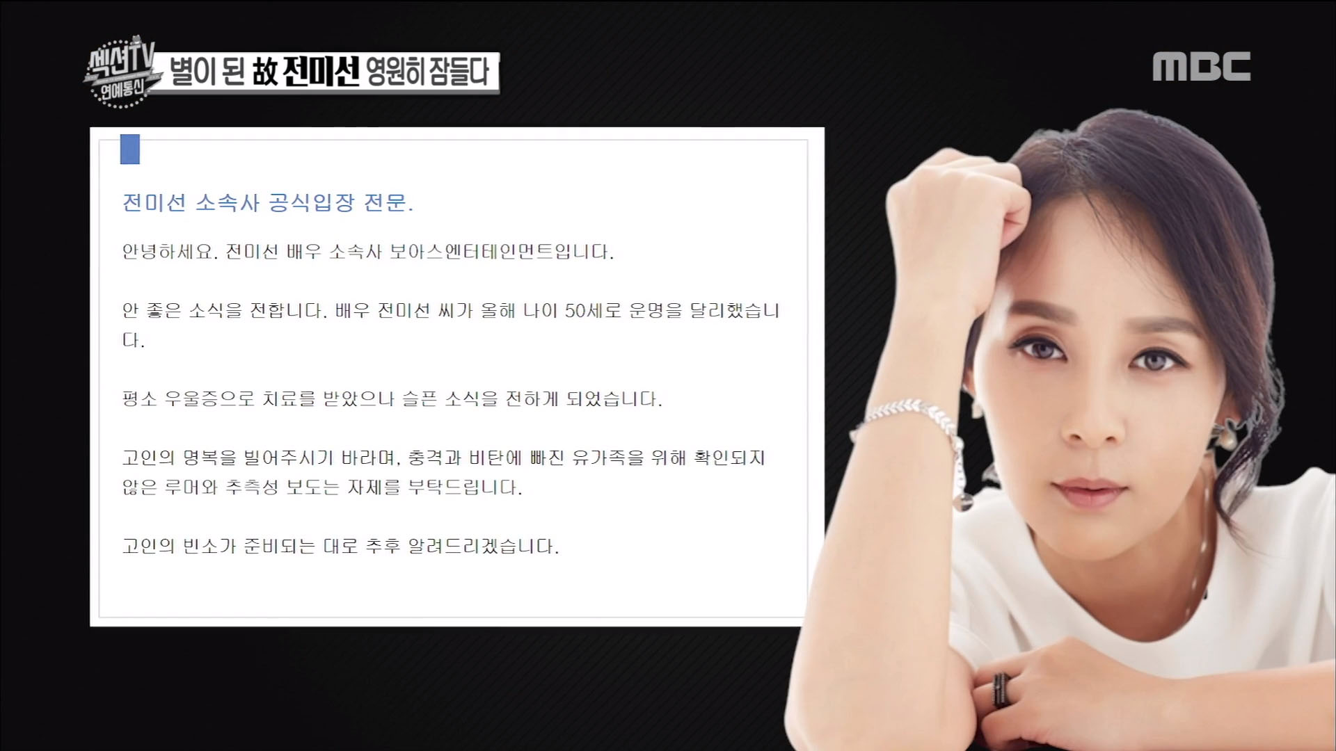 4일 방송된 ‘섹션TV 연예통신’에서는 하늘의 별이 된 배우 故전미선에 대해 방송했다.