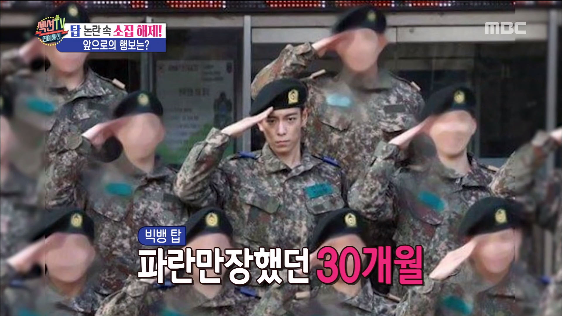11일 방송된 ‘섹션TV 연예통신’에서는 논란 속에서 소집 해제한 탑의 소식을 전했다.