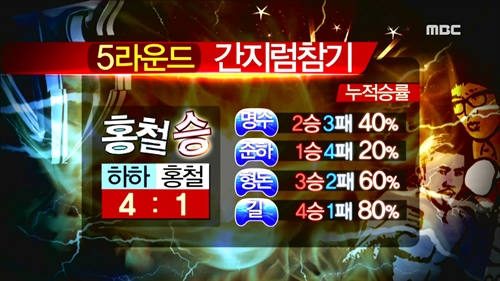그리고 이어 벌어진 '캔뚜껑 따기', '날아오는 공 받기'와 '닭싸움' 역시 하하의 대역전극이 펼쳐지며 믿기 힘든 '4연승 신화'를 기록했다. 하지만 노홍철은 역시 '럭키가이'였다. 5라운드 대결인 '간지럼 참기'에서 혼이 나간 듯한 '인내심'을 발휘해 첫 승리를 거뒀고, 이것은 '반전의 기회'가 됐다.