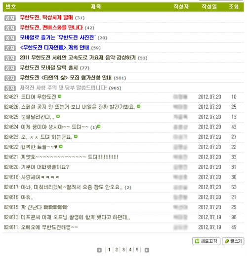 지난 18일 무한도전 맴버들은 극비리에 녹화를 재개. 트윗 맨션으로 감격의 녹화 소감을 남겨 무도팬들을 열광시켰다. 이와 더불어 <무한도전> 공식 홈페이지의 시청자 게시판도 뜨겁게 달궈지고 있다.