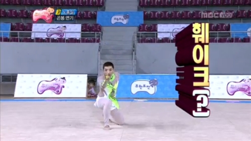 그러나 평소 몸치로 유명한 그는 곤봉을 던지고도 전혀 잡지 못하면서 여유있게 연기를 펼치는 '시간차 곤봉 연기'를 선보이는 한편, 곤봉을 던지는 척 하다가 다시 받는 척하는 '훼이크' 연기를 하는 등 체조계에서 상상할 수 없는 기술로 시청자들을 포복절도케 했다.