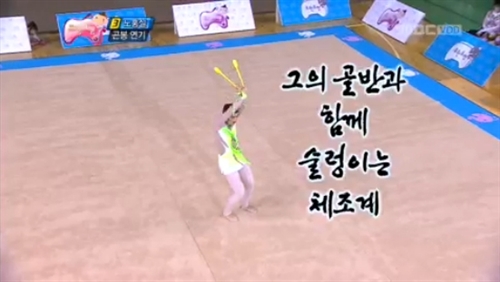 22일 방송된 MBC <무한도전> '약속한대로 with 손연재' 편에서 무도 멤버들은 체조선수 손연재를 맞아 갈라쇼를 통해 연습한 리듬체조 연기를 선보였다.