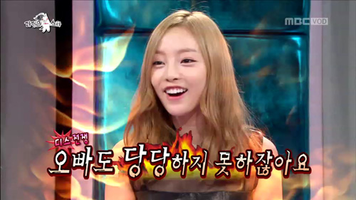카라의 막내 강지영도 애교를 보여달라는 MC들의 질문에 당황하며 "난 애교가 없다"라고 밝혔다.