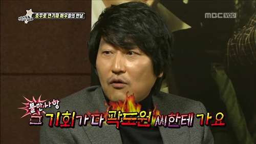 이어 송강호에게 '얼굴이 악역이라서 일부러 악역을 피한다'라는 항간의 소문에 대해 묻자, "전혀 사실이 아니다"라고 밝힌 송강호는 "매력적인 악역은 얼마든지 할 수 있다. 그런데 그 기회가 다 곽도원씨한테 간다"라며 속사정을 밝혔다.