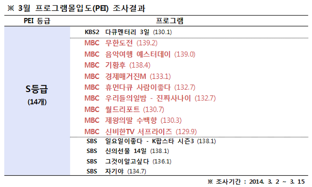 MBC는 <무한도전>과 <음악여행 예스터데이> 외에도 <기황후>와 <경제매거진M>, <휴먼다큐 사람이 좋다>, <일밤- 진짜 사나이>, <월드리포트>, <수백향>, <신비한TV 서프라이즈> 등 9개 프로그램을 S등급(14개)에 올렸다.