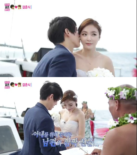 이날 방송에서는 두 사람의 로맨틱한 선상 결혼식이 눈길을 끌었다. 비록 거센 바닷바람과 눈 부신 태양 때문에 눈을 제대로 뜨기조차 힘들었지만, 충분히 낭만적이었다.