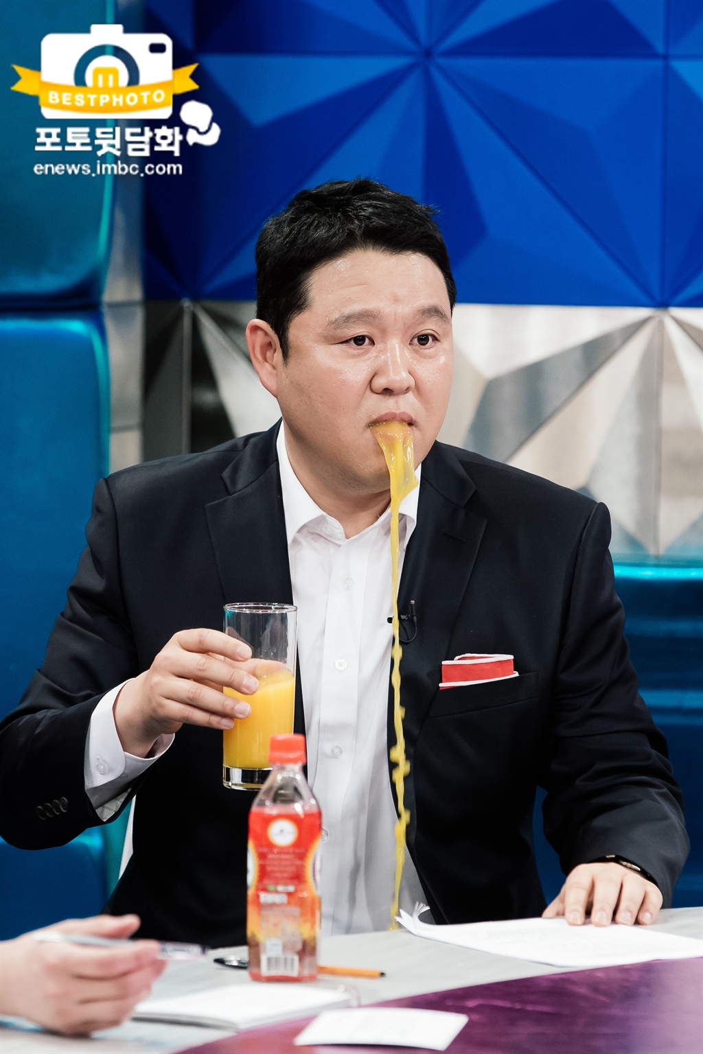 지난 28일(수) 방송된 <황금어장-라디오스타> '연기의 신' 특집에서 김구라가 주스 뿜는 리액션을 너무나도 즐거워하며 촬영에 임했다는 후문이다. 좋은 건 역시 게스트에게도 적극적으로 권하는 훈훈한 장면이 연출되었다고. 게다가 흐르는 주스를 컵으로 받지 않고 그대로 흘러내리게 하면서도 "까짓거 옷이야 빨면 되지."하는 쿨한 모습으로 제작진의 박수를 받았으나 한쪽에서 울고 있는 코디를 달래야했다는 소문이...