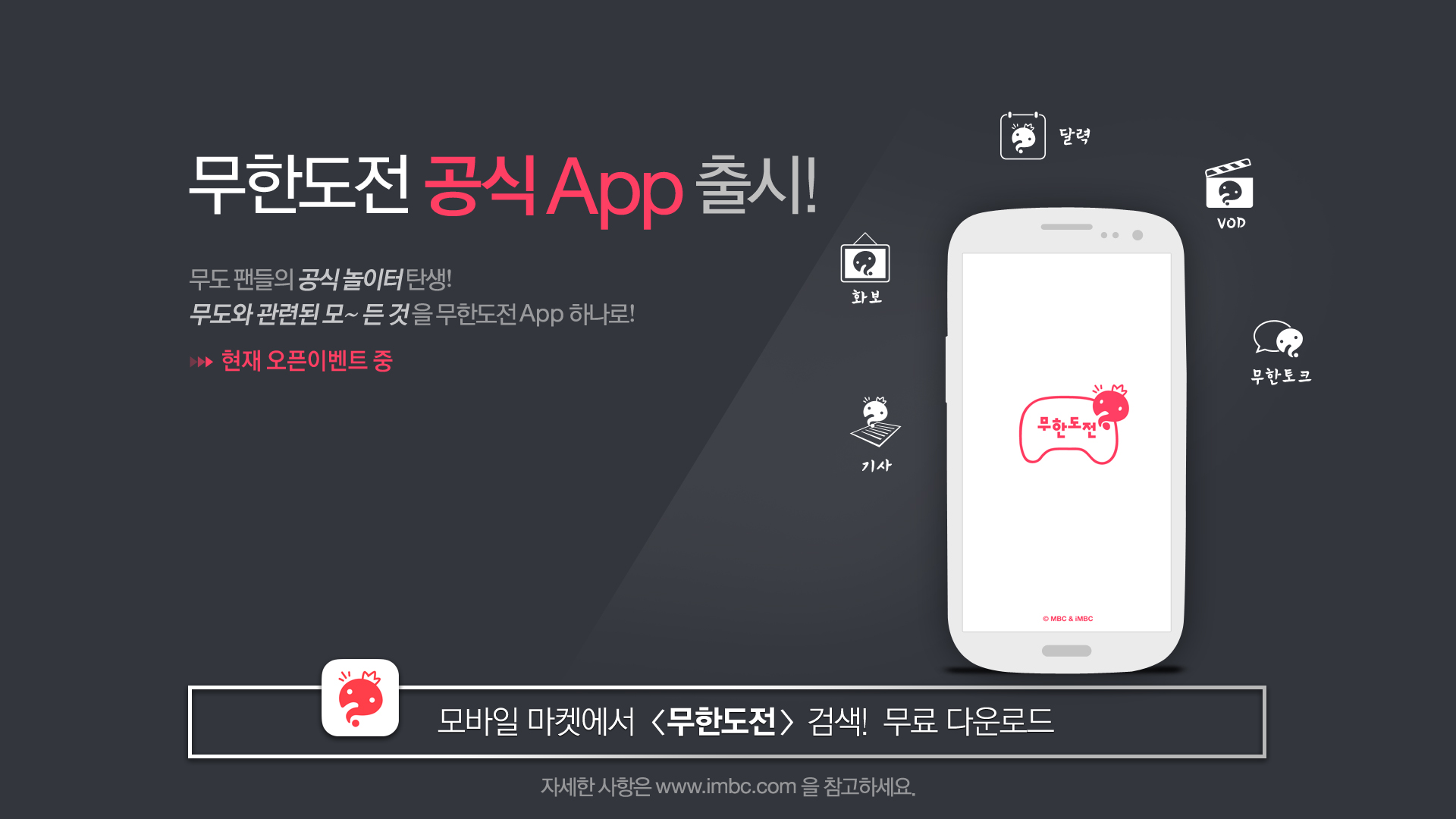MBC 대표 예능프로그램 <무한도전>의 공식 어플리케이션이 안드로이드의 구글플레이와 아이폰 App Store에서 론칭되었다.