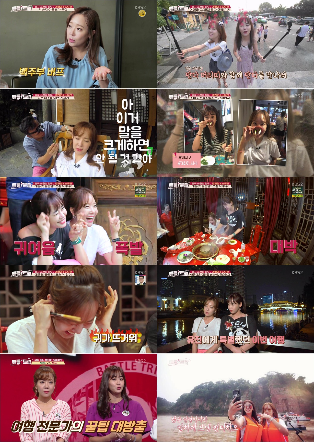 지난 25일 방송된 KBS 2TV ‘배틀트립’에서는 ‘부담 없는 막바지 여름휴가’를 주제로 오나미-이수경, 소유진-강래연이 출연했다. 이번 주에는 필리핀 세부로 떠난 오나미-이수경에 맞서, 소유진-강래연이 중국 사천성에 위치한 ‘청두’로 떠난 ‘쩐더 하오(진짜 좋아) 투어’가 공개돼 이목을 집중시켰다. 특히 화교 출신이자, 중국 전문가로 알려진 강래연은 “내 장점 살려?”라며 중국 여행에 대한 자신감을 드러내 기대감을 형성했다.